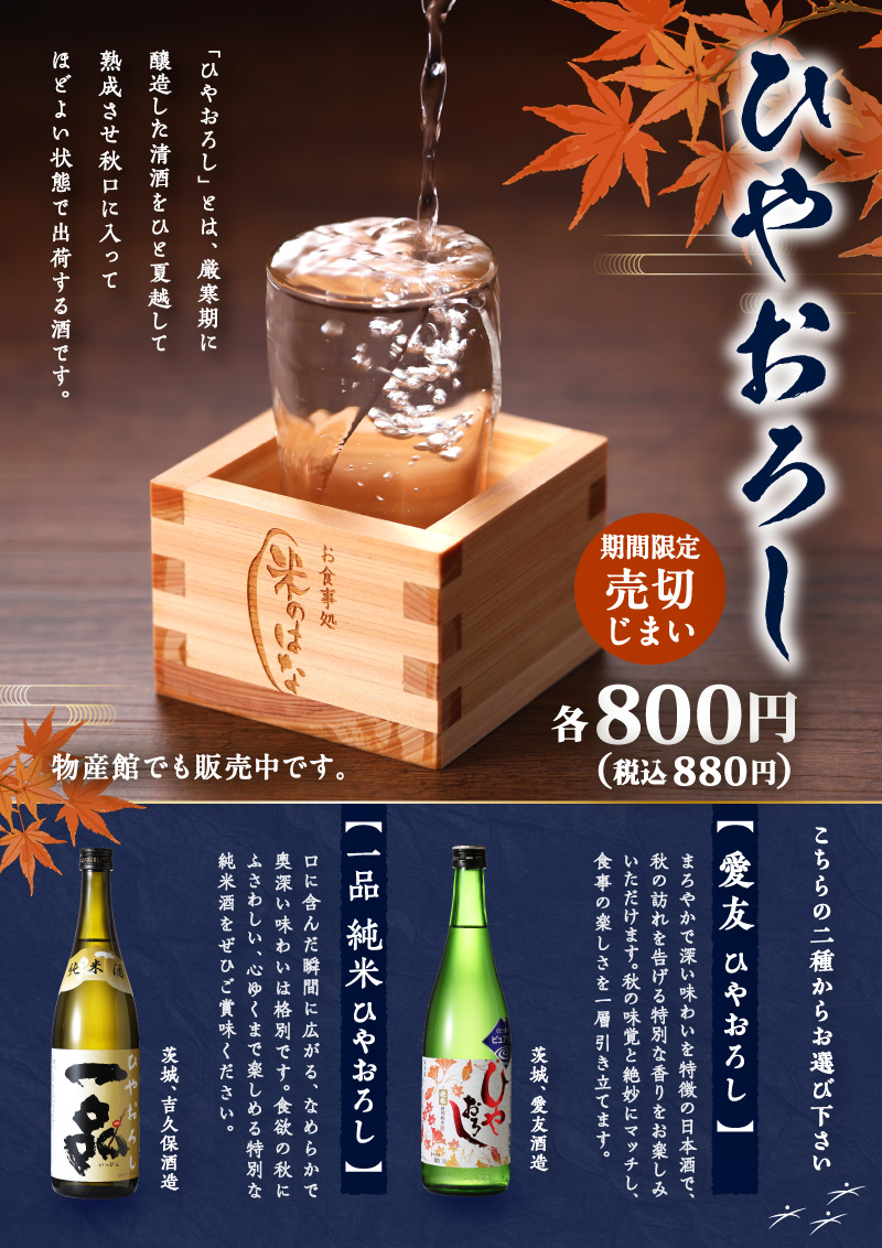 10月よりお食事処「米のはな」にて「ひやおろし」を提供しております。