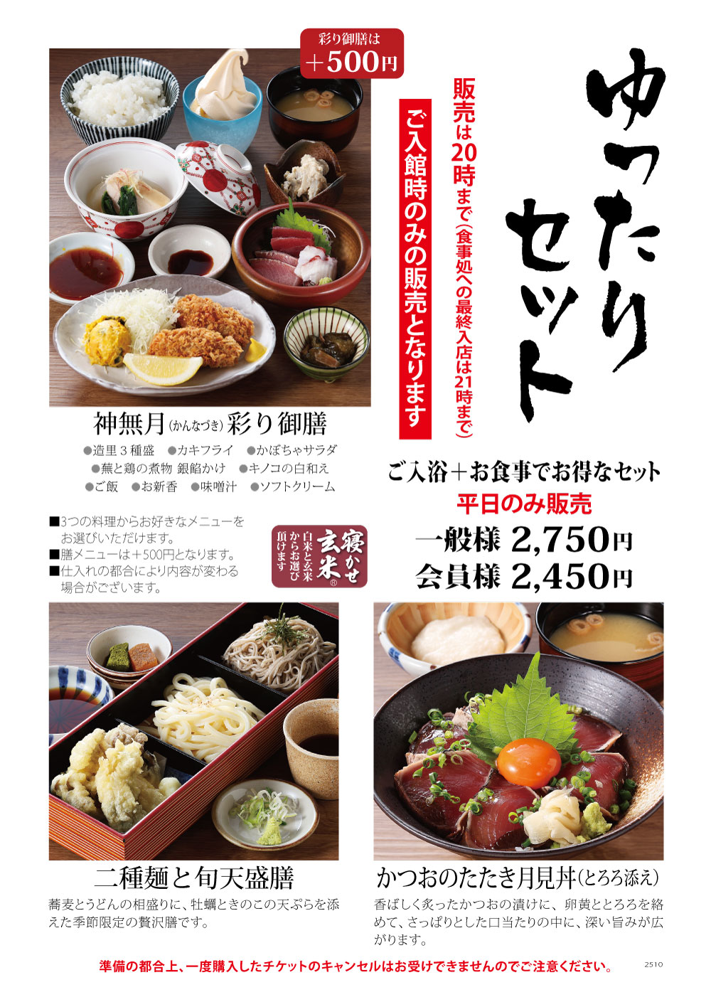 10月の「ゆったりセット」ご入浴+お食事でお得!